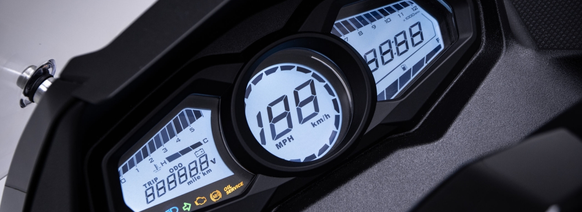 STRUMENTAZIONE: Digitale LCD: conta km tot/parziale - tachimetro in km/h o mph- contagiri - orologio digitale - indicatore livello carburante - indicatore voltaggio batteria - indicatore liquido refrigerante